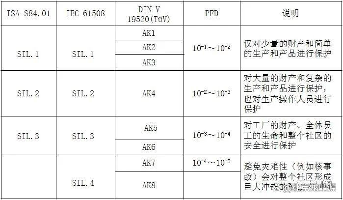 Conform standardului IEC, acesta este împărțit în SIL1-SIL4 de la scăzut la înalt, SIL1-SIL3 de la ISA 84.01 și AK1-AI8 de la scăzut la mare conform DIN V VDE0804. Relația corespunzătoare dintre ei este următoarea.